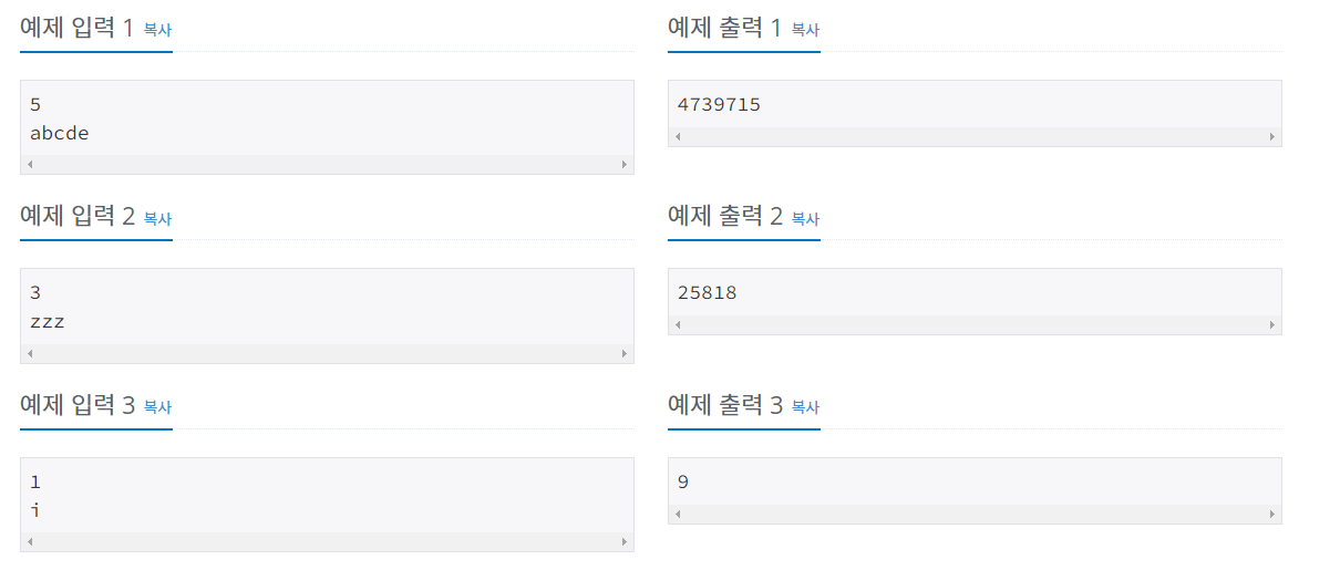 첫 줄에는 문자열의 길이 L이 들어온다. 둘째 줄에는 영문 소문자로만 이루어진 문자열이 들어온다.